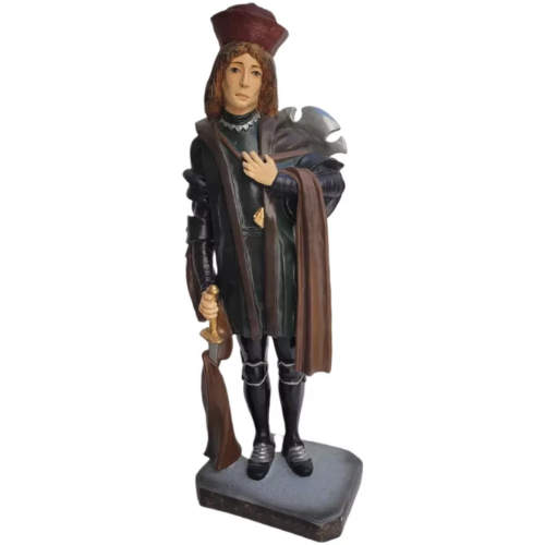 São Roque, venerado por sua devoção e serviço aos doentes, é um exemplo de compaixão e fé para muitos fiéis em todo o mundo. Esta representação meticulosamente esculpida captura a essência da generosidade e da coragem associadas a São Roque, convidando à reflexão sobre a importância da solidariedade e da esperança em tempos de doença e adversidade.